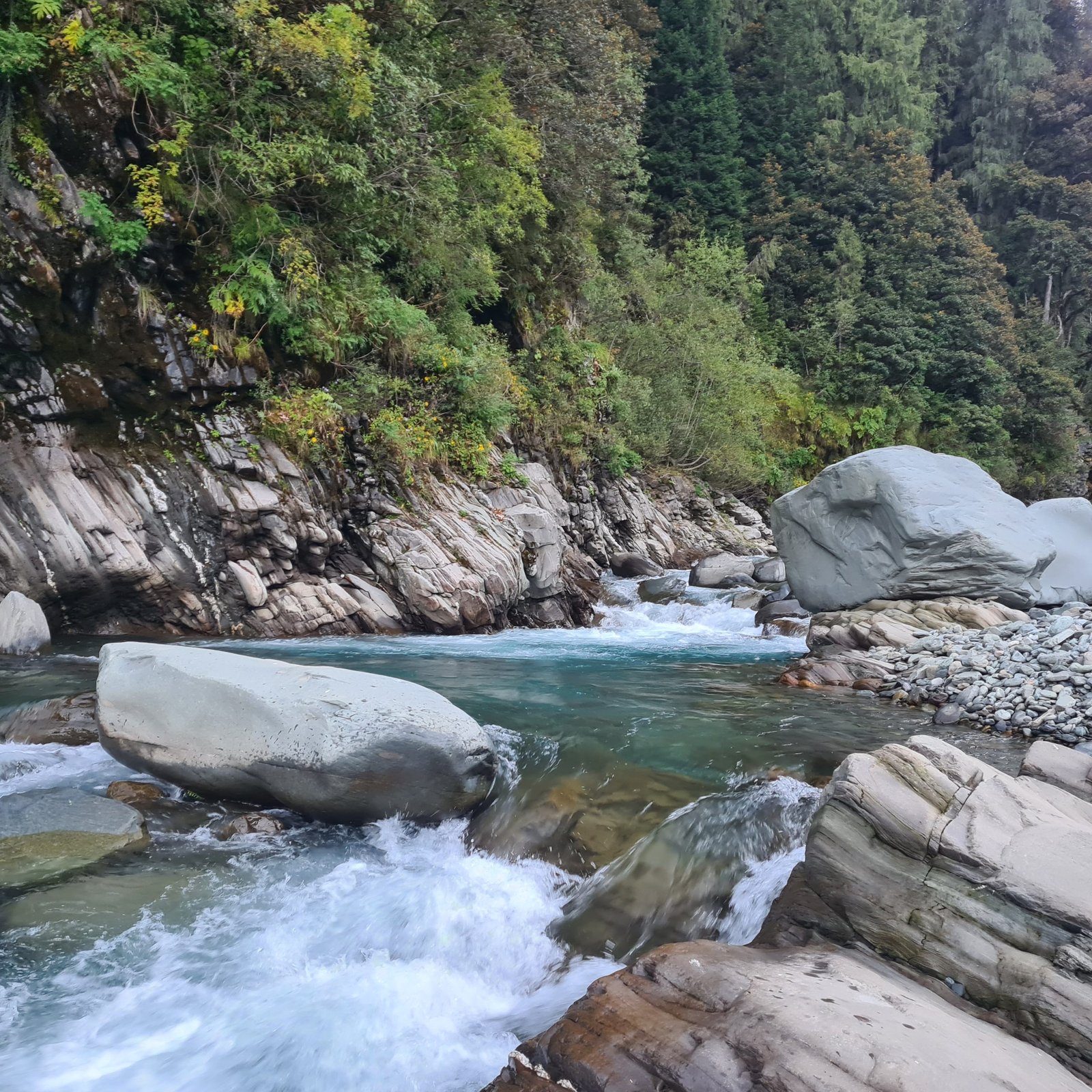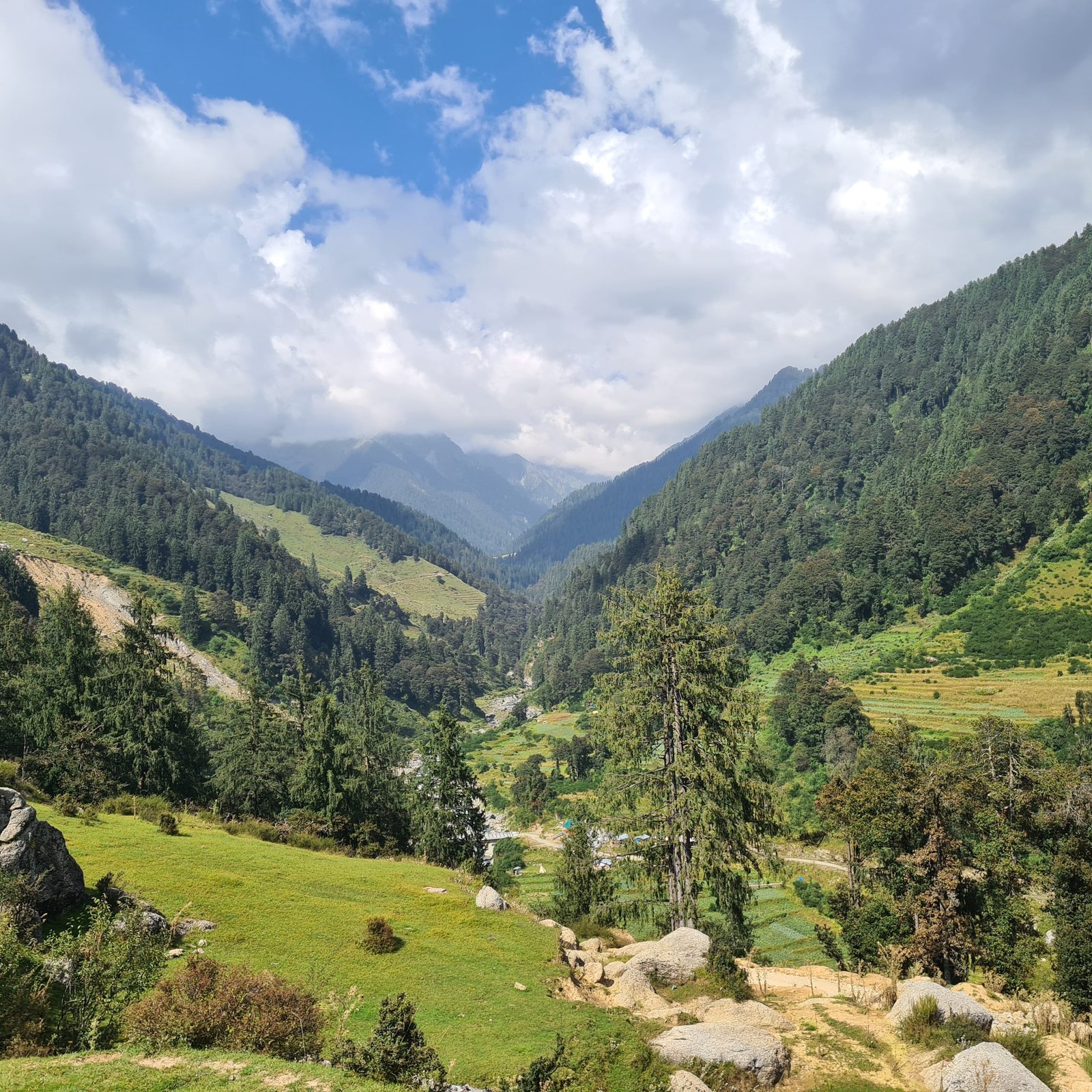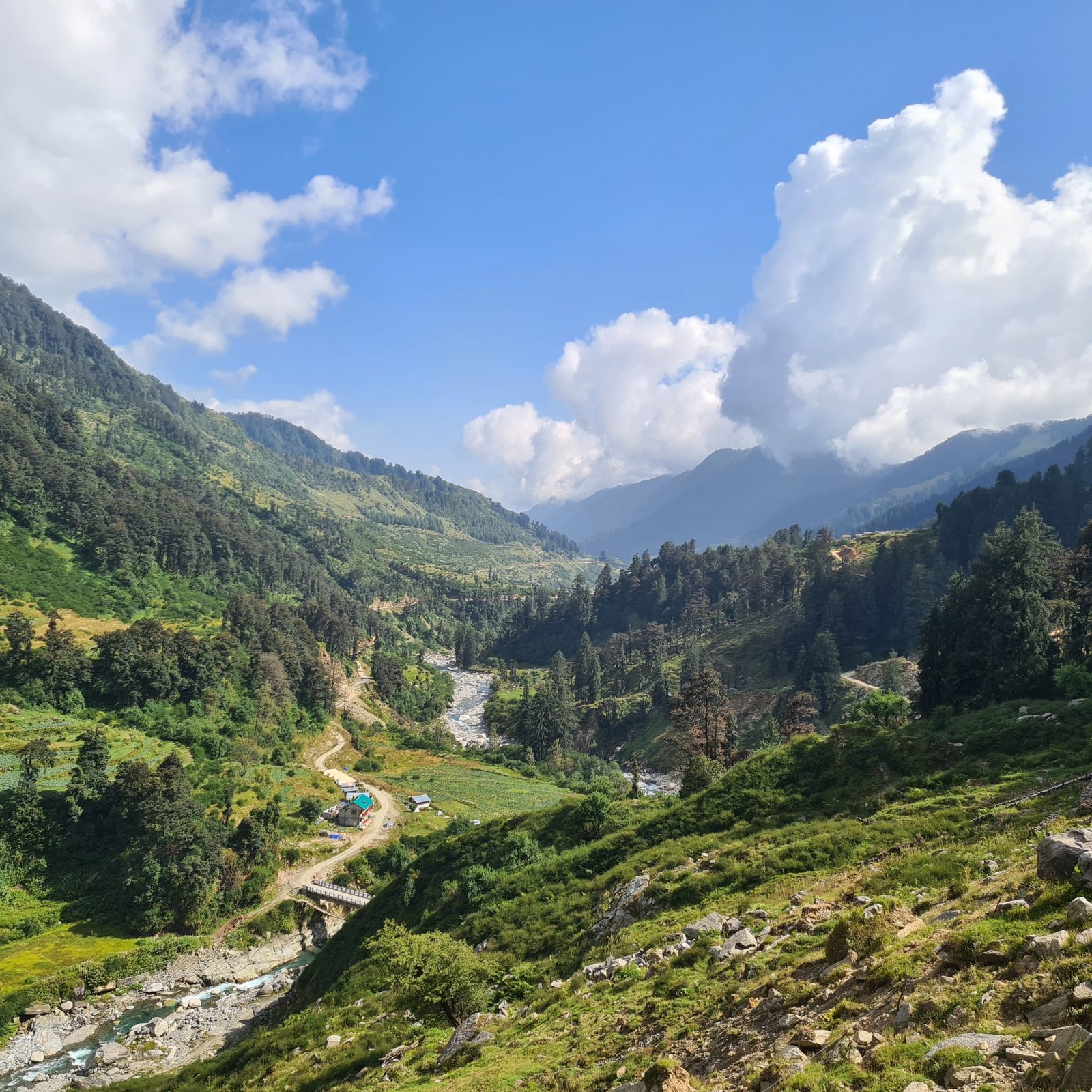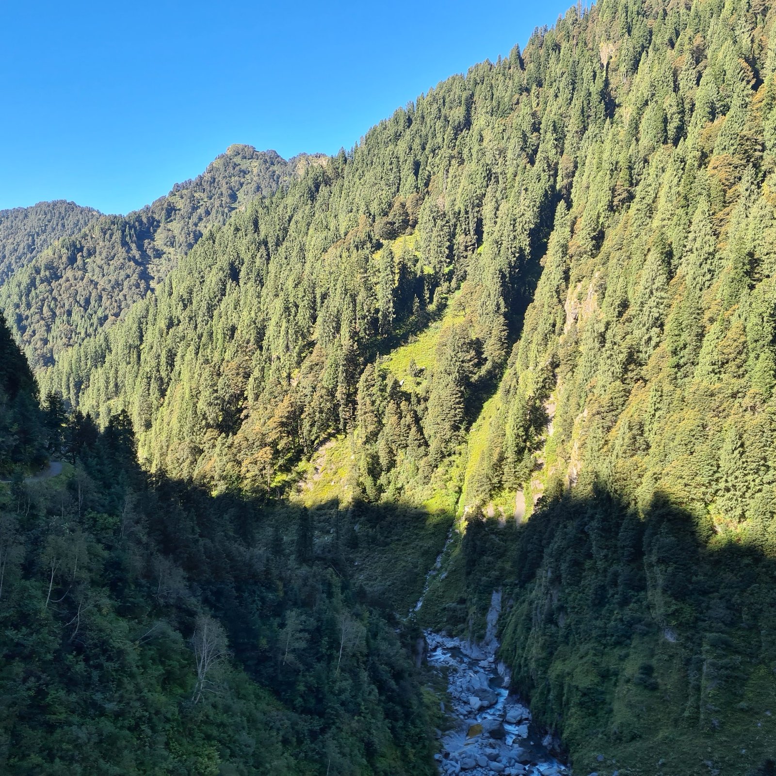 Trek from Bara Bhangal to Dhardi 18 km distance from Bara Bhangal to Dhardi. This is a long trek over a very strenuous and difficult terrain involving steep vertical rock cliffs great balance and patience. The trek head down the river and enters immediately into deep gorges. Magnificent views of mountains on all sides greet the eyes. It takes about 4 to 6 hours to reach Dhardi village. There is one short tricky rock face 200 feet above the river; the rest of the trek is easy. Stay overnight here.