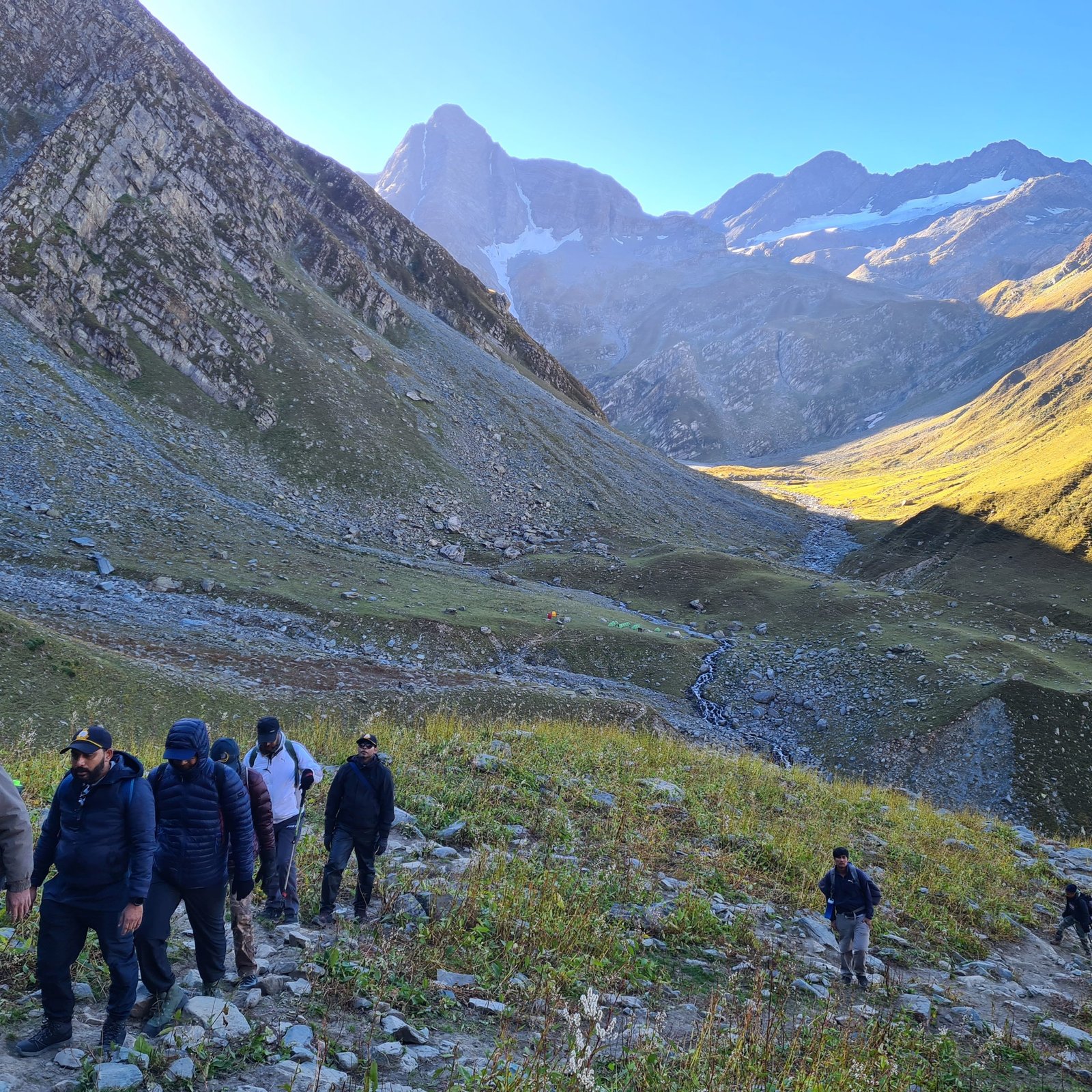 Trek from Bhadpall to Udeg/ Marhi via Thamsar Pass The trek on day will take around 6 to 7 hours on which you come across many scenic views. Passing through morains, will we cross the Thamsar Pass lake from where we can replenish our water needs. Form the top of the Thamsar Pass, we can witness the alluring views of the Bara Bhangal valley. Finally, after walking a bit more hours, we will make it to Marhi. We will stay here overnight.