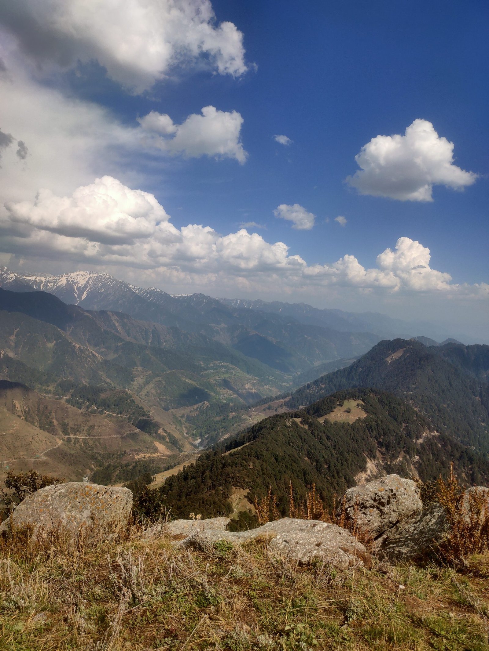 After a few hours, the forest thins out into open alpine meadows used by Gaddi shepherds during summer. These rolling grasslands are dotted with temporary stone huts and grazing sheep. The views widen dramatically, revealing snow-clad Dhauladhar peaks and deep valleys below. This is one of the most scenic parts of the trek.